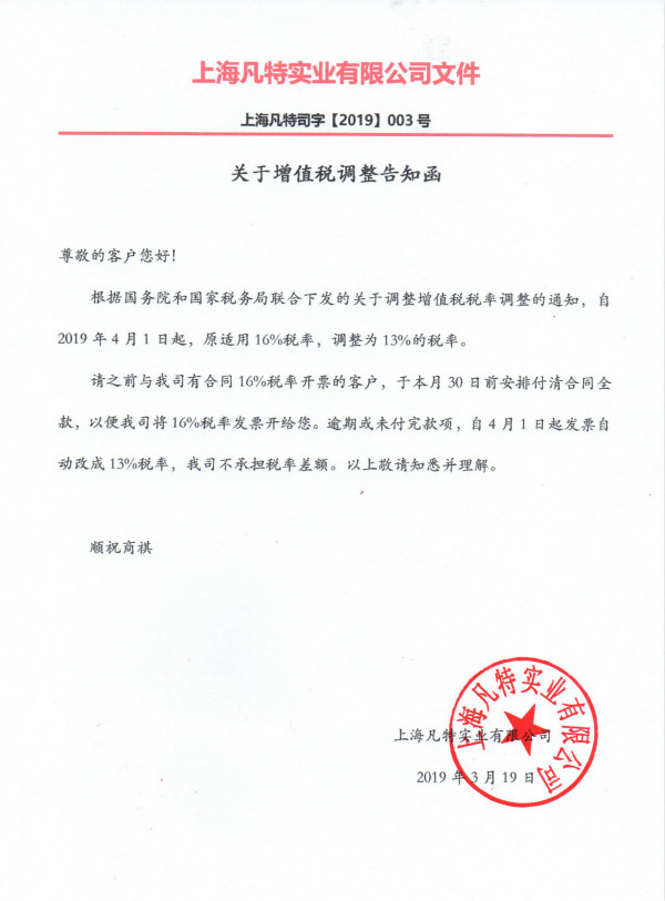 請(qǐng)之前與我司有合同16%稅率開(kāi)票的客戶,于本月30日前安排付清合同全款,以便我司將16%稅率發(fā)票開(kāi)給您。逾期或未付完款項(xiàng),自4月1日起發(fā)票自動(dòng)改成13%稅率,我司不承擔(dān)稅率差額。以上敬請(qǐng)知悉并理解。