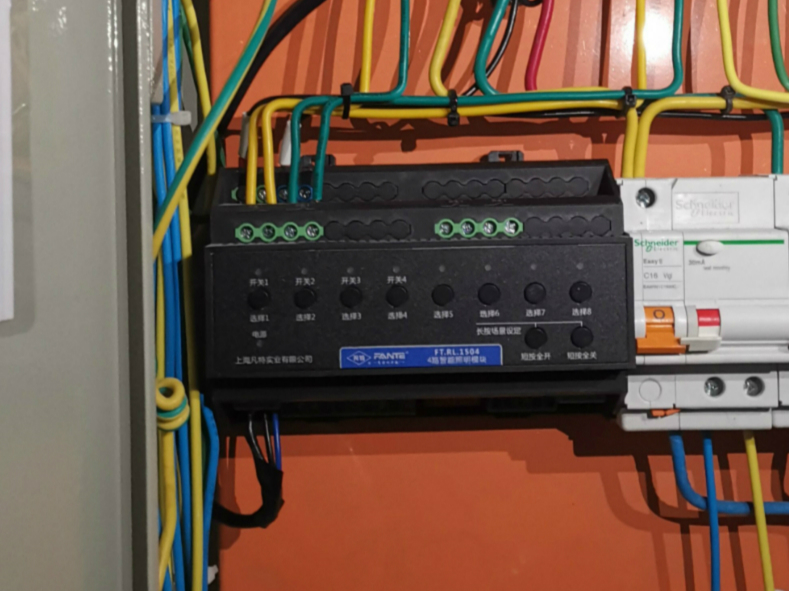 該智能照明控制系統(tǒng)項(xiàng)目采用的是經(jīng)濟(jì)型4路、8路智能照明模塊以及485有源集線器,均安裝在電箱內(nèi),導(dǎo)軌安裝。