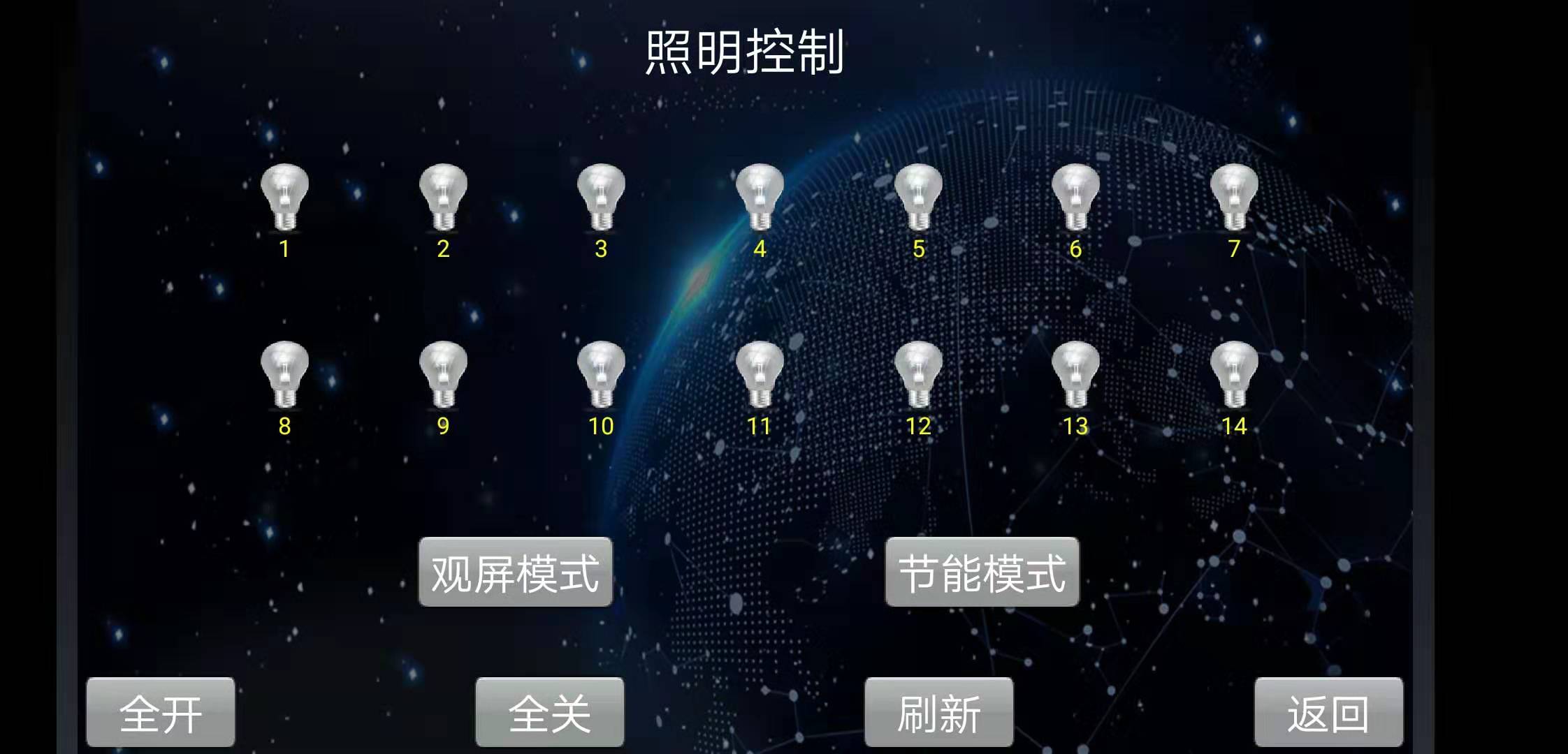 燈具:控制項(xiàng)目?jī)?nèi)的所有燈光照明,每個(gè)燈光回路可實(shí)現(xiàn)單獨(dú)控制,并設(shè)計(jì)了多種控制場(chǎng)景,如觀屏模式、節(jié)能模式、全開模式、全關(guān)模式等,使燈光控制變得更加智能、更加便捷。