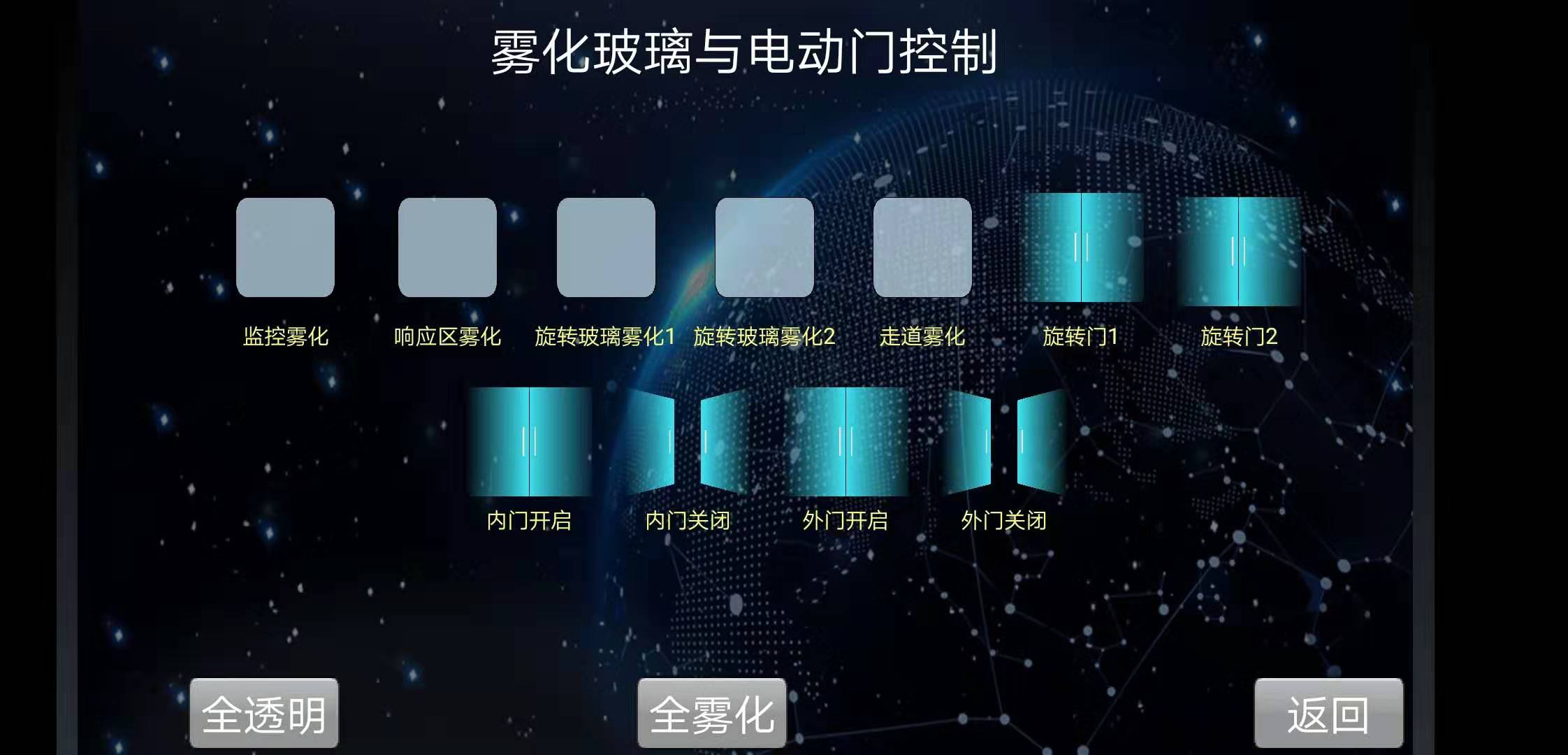 霧化玻璃與霧化玻璃門:調(diào)度中心有五組霧化玻璃,其中兩組為可旋轉(zhuǎn)霧化玻璃門。經(jīng)過技術(shù)對(duì)接以后,通過控制霧化玻璃的干接點(diǎn)信號(hào),閉合則控制霧化玻璃門透明,斷開則控制霧化玻璃門霧化。旋轉(zhuǎn)門也同樣控制干接點(diǎn)信號(hào),閉合則旋轉(zhuǎn)九十度,斷開則復(fù)原。
