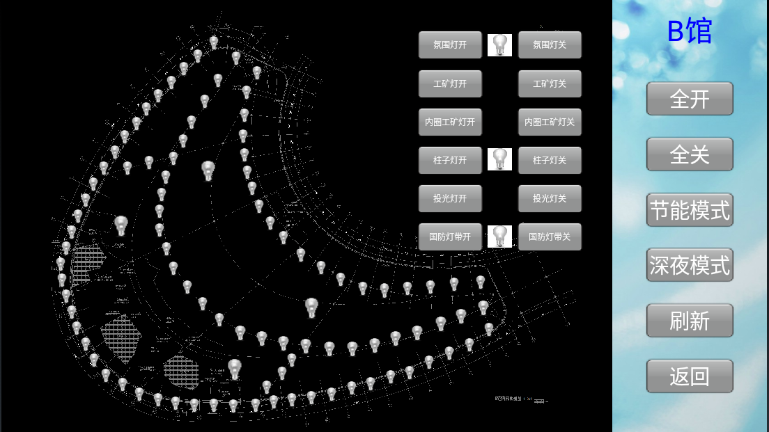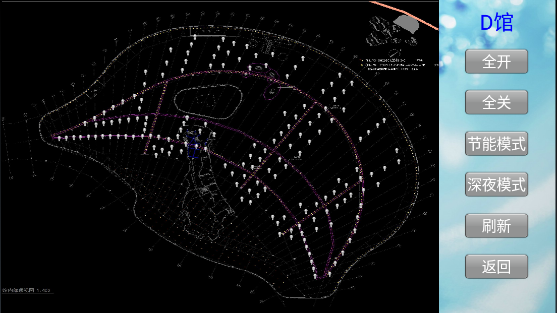 根據(jù)夏日晝長夜短、冬日晝短夜長的氣候特點以及開館、閉館的時間,預設燈光自動亮起、關閉的時間,避免忘關、漏關等現(xiàn)象;深夜客流量少時根據(jù)部分場館的需求可預設其所需的亮度(如下圖:深夜模式)