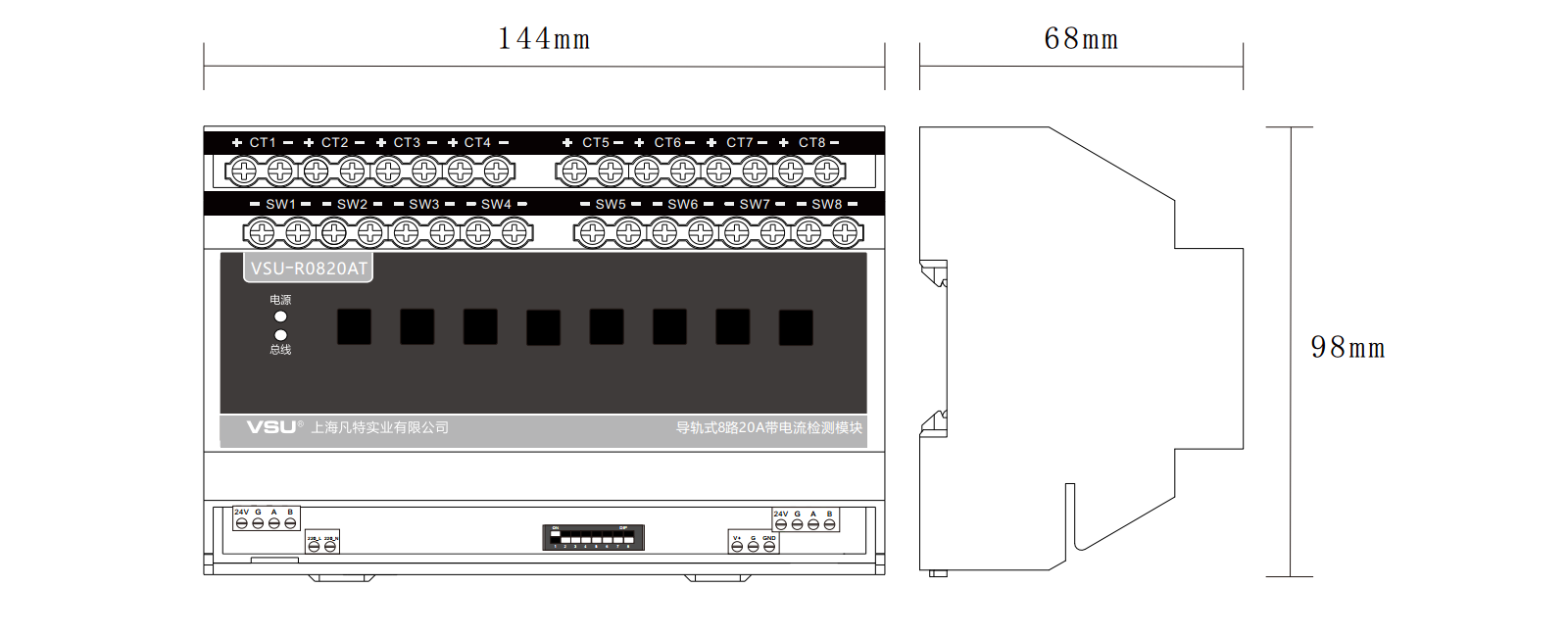 1,標(biāo)準(zhǔn)導(dǎo)軌式安裝占8個(gè)模數(shù)位;
