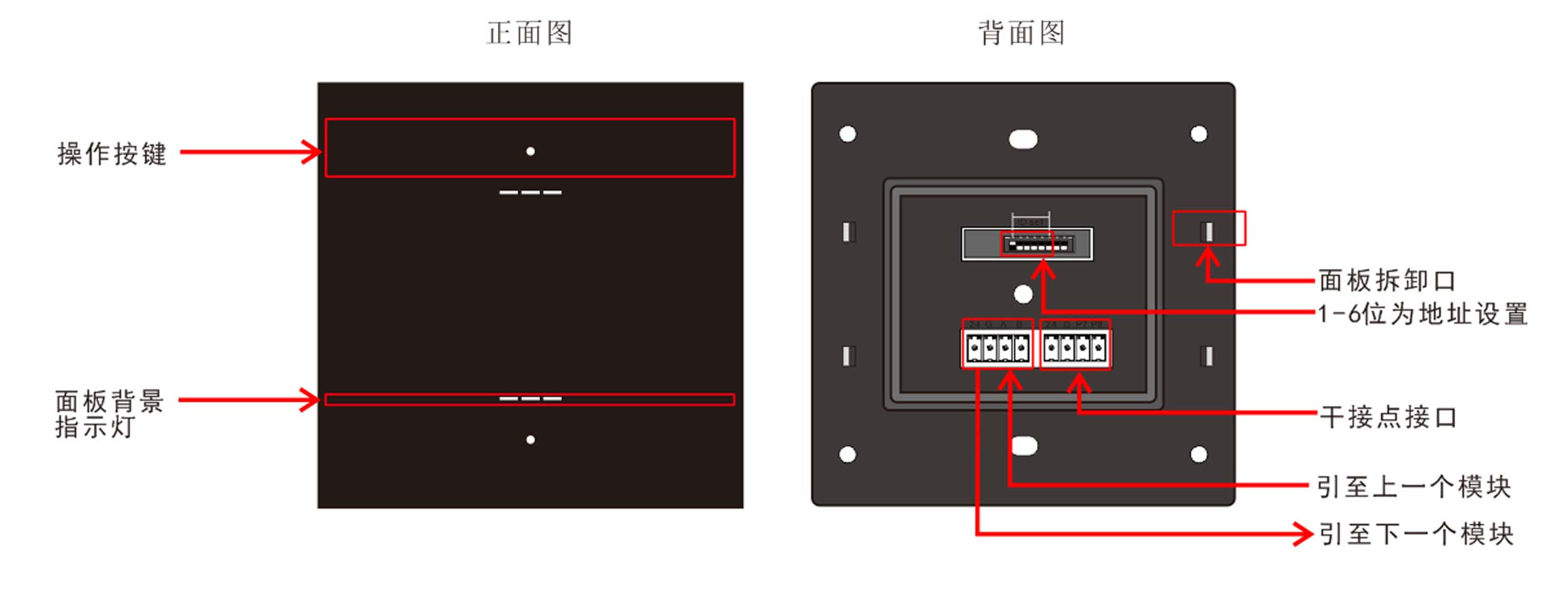標(biāo)準(zhǔn)86底盒安裝,支持無縫聯(lián)接,提供2鍵,每個按鍵帶1路LED指示燈,復(fù)位式輕觸開關(guān),結(jié)構(gòu)成熟,性能穩(wěn)定,標(biāo)準(zhǔn)工藝,采用塑料材質(zhì)(顏色可選灰色、黑色和香檳金);自帶感應(yīng)式背光燈;提供兩路IO輸入可外接傳感器。