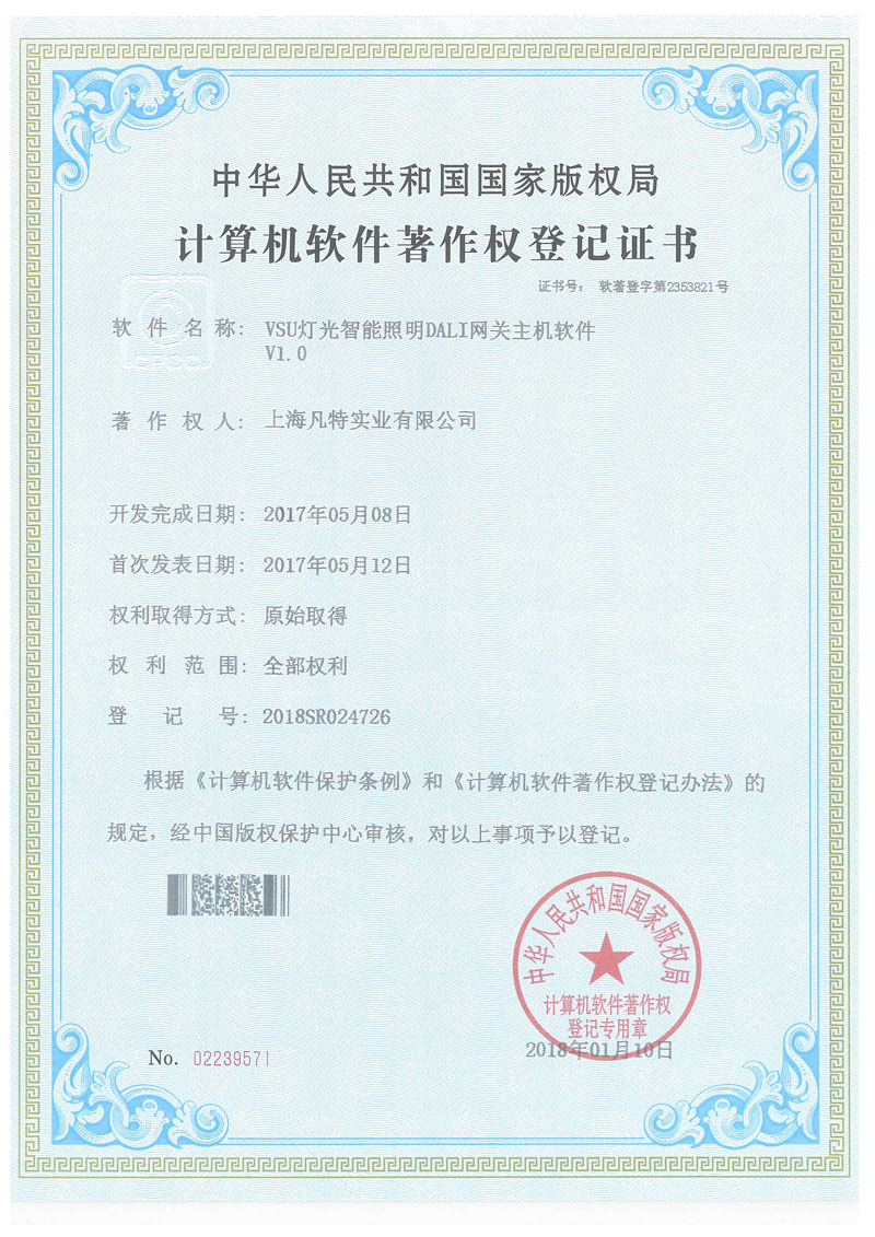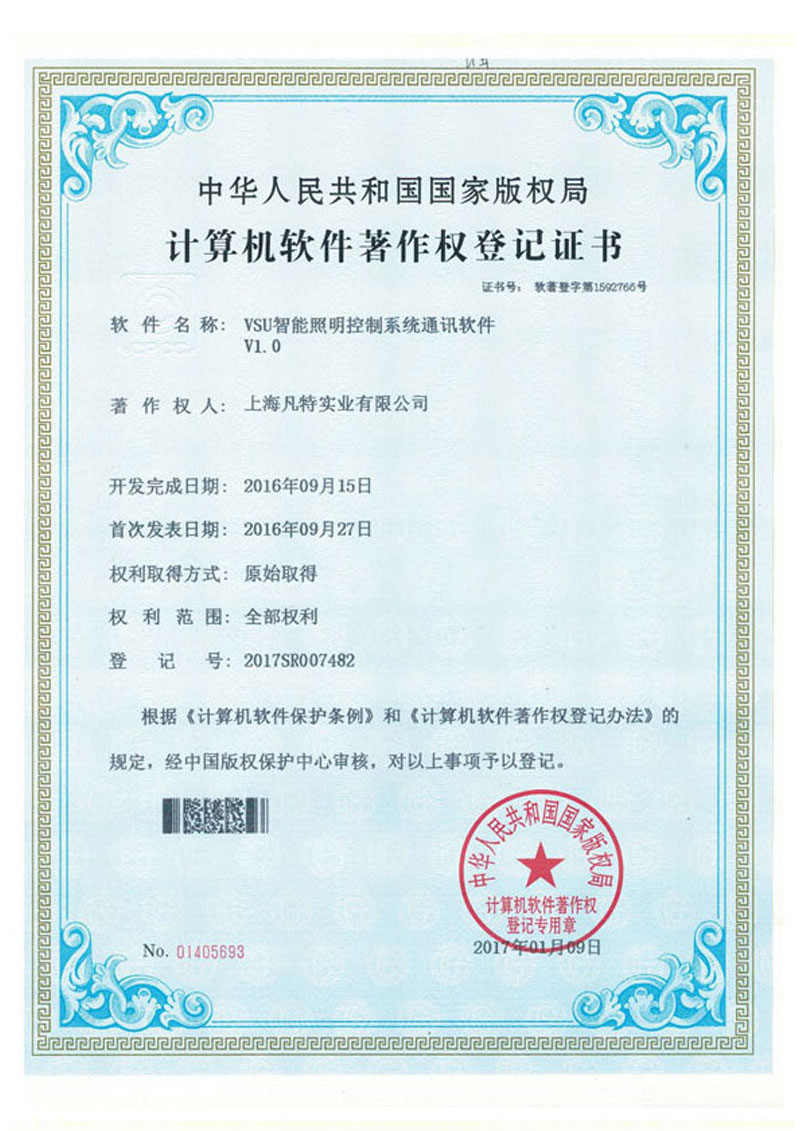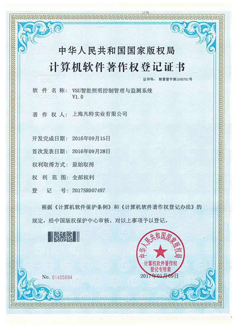 VSU智能照明有多項(xiàng)自主知識產(chǎn)品證書,所有產(chǎn)品都經(jīng)過國際CE認(rèn)證,符合國際電工標(biāo)準(zhǔn)。
